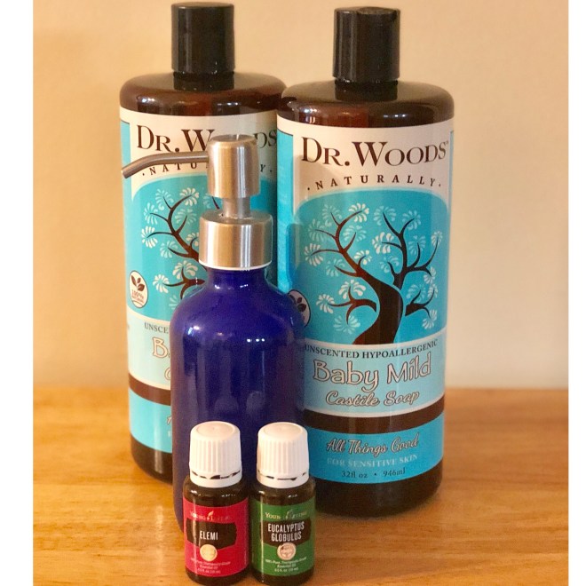 09.17 I bought three 32 oz. bottles of Dr. Natural’s Unscented Castile Soap from Amazon for $10.19 a bottle + free shipping… little under $32 bucks total. I tossed all the fragrance-filled handsoaps, body washes, cleaners (replaced all my cleaners with one cleaning product- Thieves), etc & set out to make our own.